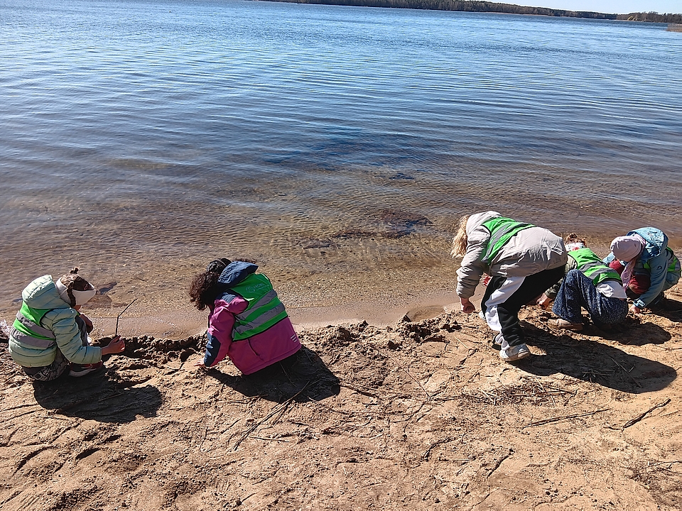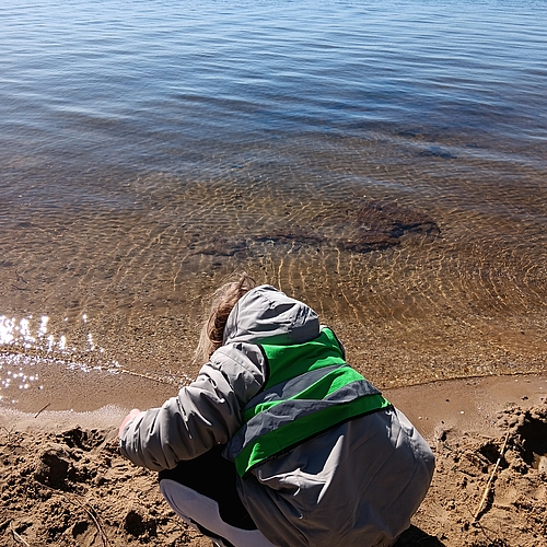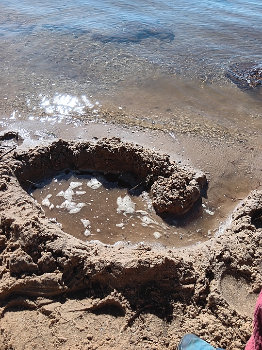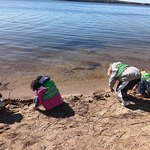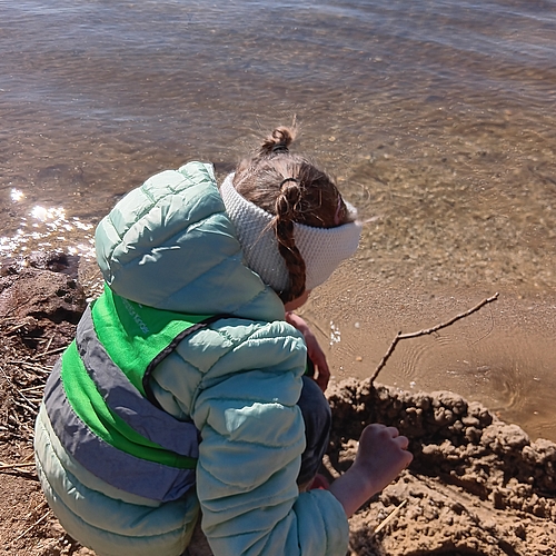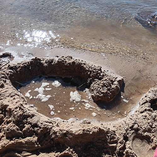Am Strand haben wir Steine über das Wasser hüpfen lassen und eine Sandburg gebaut.