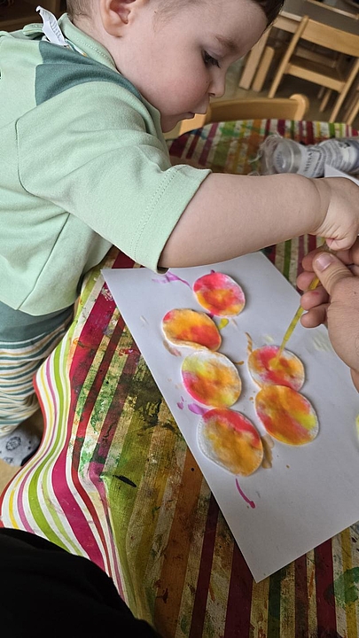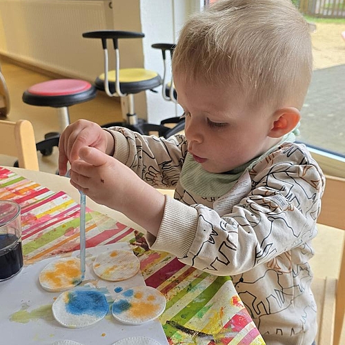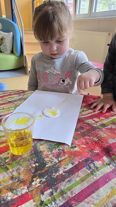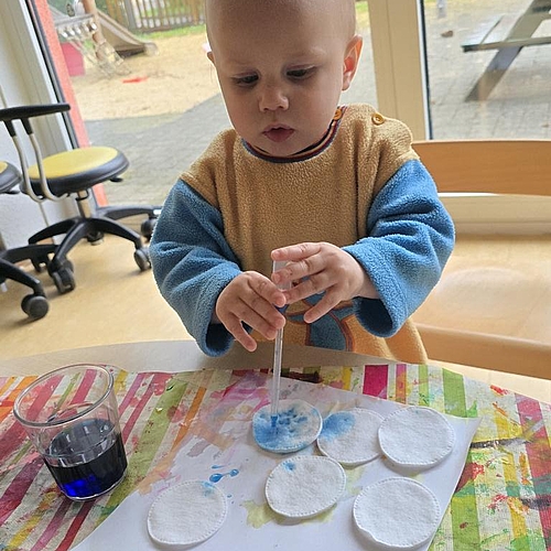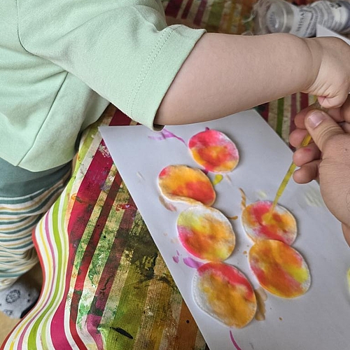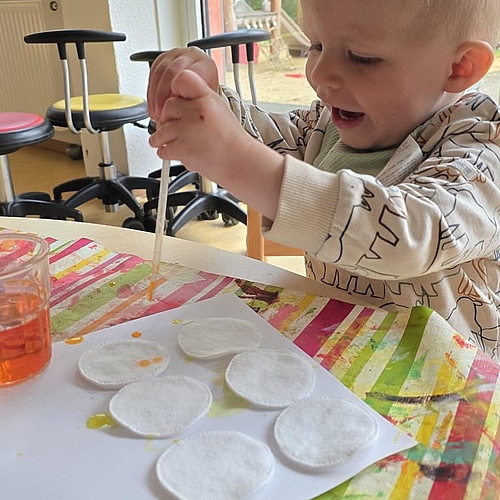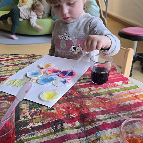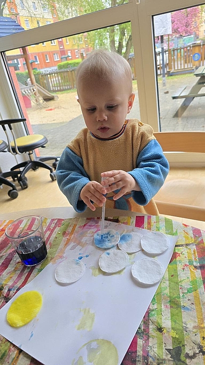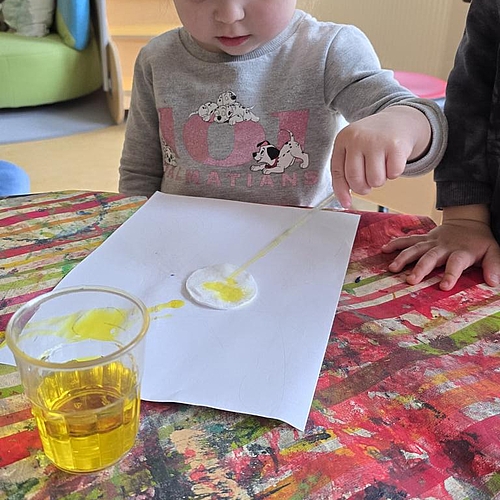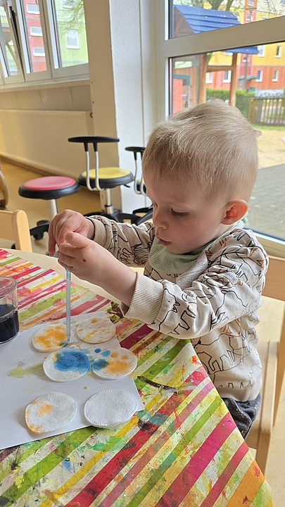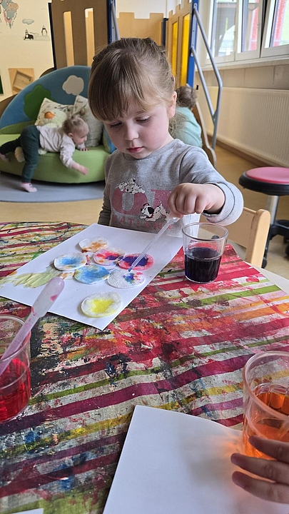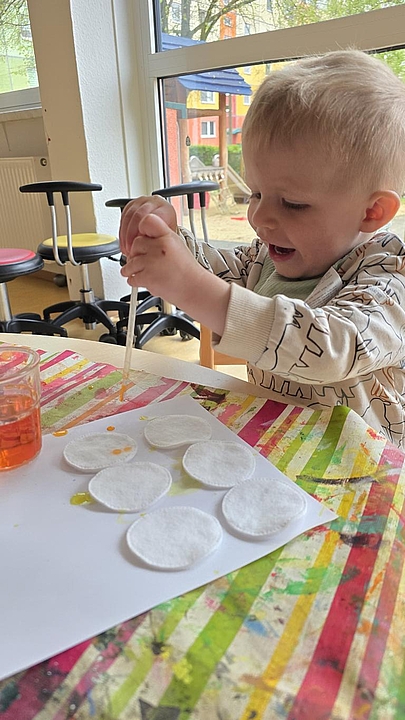 Dafür schnappen wir uns Wattepads, Lebensmittelfarbe, Wasser und Pipetten. Mit gelbem, rotem, orangenem und blauem Wasser färben wir die Wattepads ein und kreieren damit die Blütenblätter unserer Blumen. Diese kleben wir dann auf, um die Blüten zusammenzufügen.