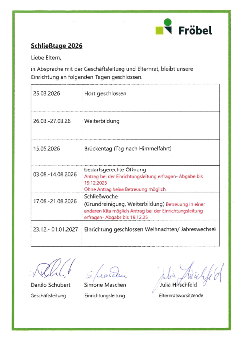 - bedarfsgerechte Öffnung/ Betreuung in einer anderen Einrichtung möglich. Antrag bis 19.12.2025 bei Einrichtungsleitung erfragen